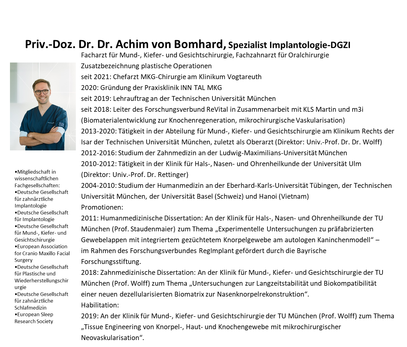 PD Dr. Dr. Achim von Bomhard und die DGZI laden alle interessierten Mitglieder sowie potenzielle Neumitglieder herzlich ein, sich an den kommenden Terminen aktiv zu beteiligen und den Standort Rosenheim als Zentrum für implantologischen Wissenstransfer weiter zu stärken. Kontakt & Termine: Informationen zu den nächsten Veranstaltungen erhalten Sie über die DGZI-Geschäftsstelle oder direkt über die Praxisklinik INN TAL MKG in Rosenheim (praxis@inntal-mkg.de).